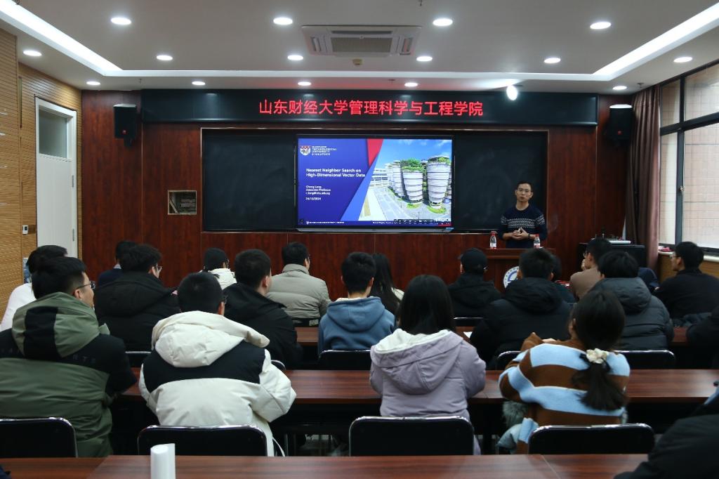 12月24日,我院邀请南洋理工大学计算与数据科学学院龙程副教授进行了主题为“高维矢量数据的最近邻搜索”的学术讲座,本次讲座由副院长刘政敏教授主持,我院和计算机与人工智能学院研究生50余人参加了学术讲座。