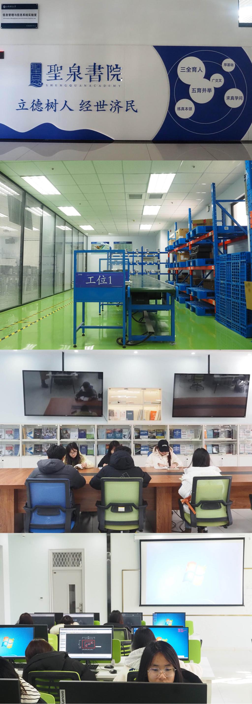 2024年3月,“圣泉书院创新实践育人基地”正式启用,为学生提供了专业前沿的实验实践平台。圣井校区九号教学楼三楼走廊内,学院结合美育与教育通过蓝白色文化墙的形式介绍了“圣泉书院”的建设主旨和育人体系。书院内设图书馆及五大实验室,图书馆拥有500余本专业书籍,强化学生通专融合阅读和创新实践能力;科研实训场地采用“4+1”模式,配备现代化设施,支持教育教学和科研探索,促进学生与科技前沿的对接,培养创新人才。