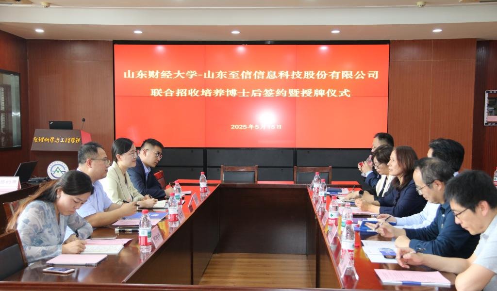 2025年5月15日,山东财经大学与山东至信信息科技股份有限公司联合招收培养博士后签约暨授牌仪式在燕山校区成功举行。山东财经大学人才工作办公室主任刘淑芳、管理科学与工程学院党委书记崔东峰、院长刘位龙、副院长王洪海、泰山学者关洪军、学院办公室主任孙涛,山东至信信息科技股份有限公司总经理张文龙、人力资源总监张茂亭、企划总监贾艳娇和行政经理张迟共同出席了此次仪式。