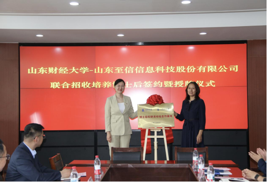 紧接着,山东财经大学人才工作办公室主任刘淑芳为“山东财经大学-山东至信信息科技股份有限公司博士后科研流动站合作基地” 授牌,标志着校企合作迈出坚实一步。