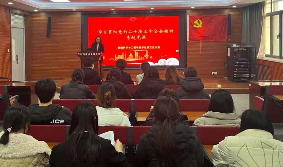 根据《管理科学与工程学院科级及以下干部、党员学习贯彻党的二十届三中全会精神培训方案》,学生第三党支部组织学生学习党的二十届三中全会精神,支部书记王桂月为支部党员讲了专题党课。
