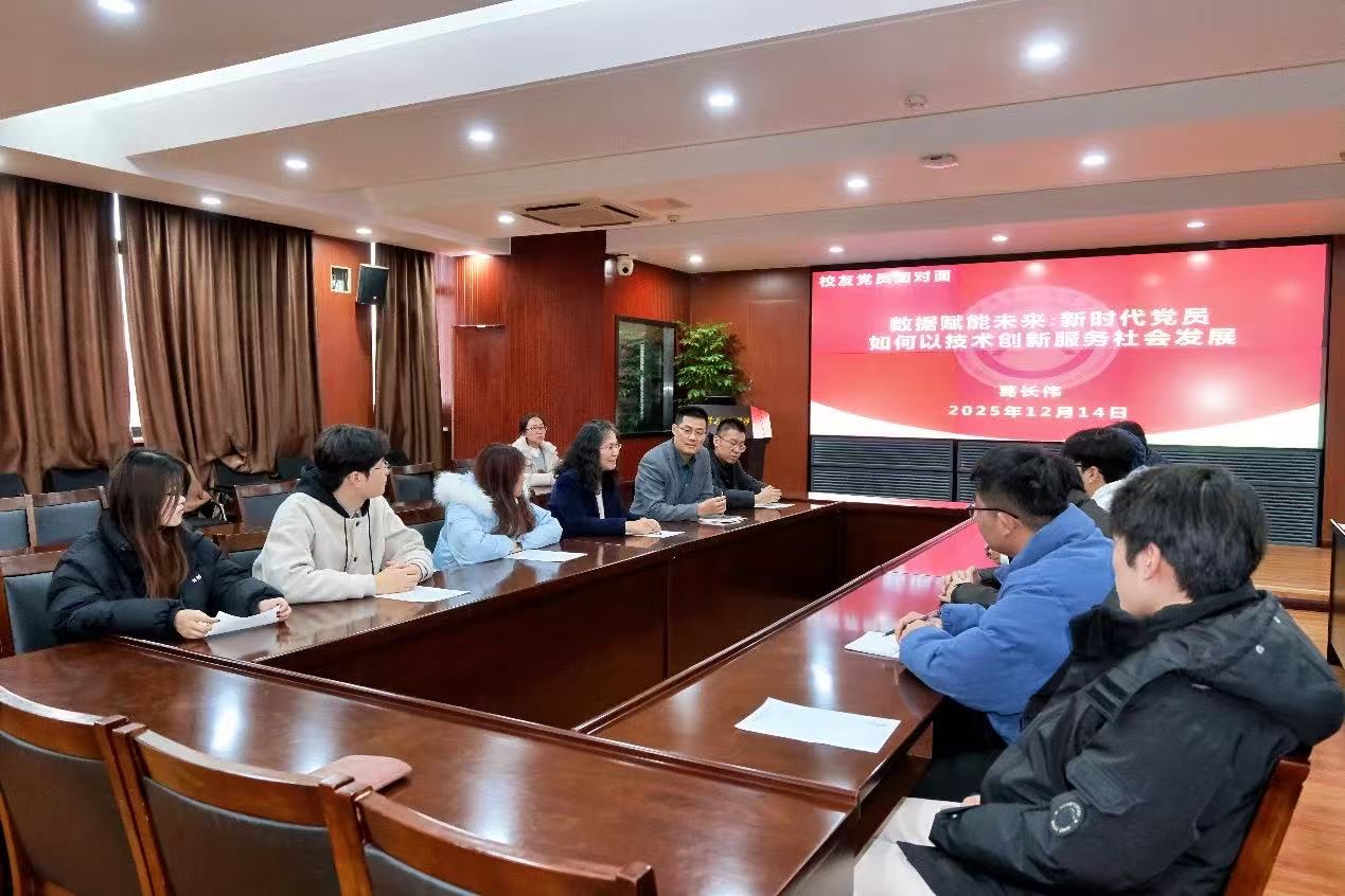 交流中,葛长伟校友以“数据赋能未来:新时代党员如何以技术创新服务社会发展”为主题,结合个人从校园求学至职场深耕的经历,分享心得体会。他勉励同学们在大学期间树立积极向上的思维方式,注重修身养性;增强时代使命感,培育利他情怀;积极投身技术创新,以专业能力服务社会;不断提升管理效能与学习能力;始终保持对知识的热爱与追求。