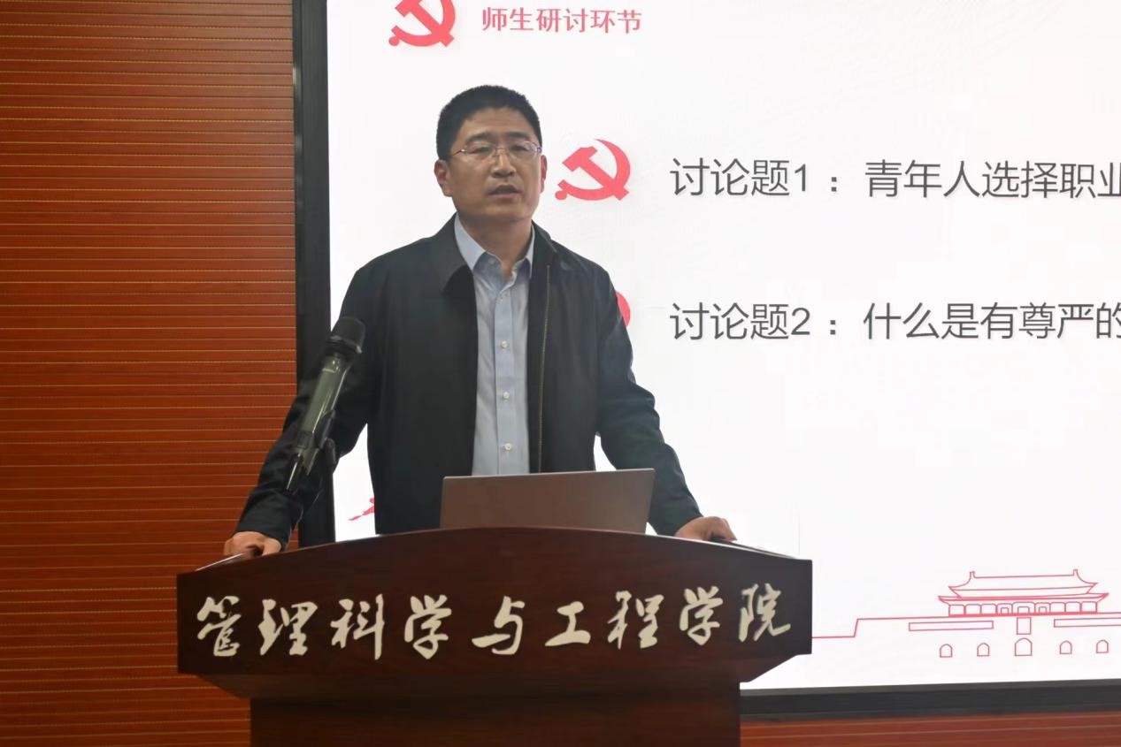 活动分为宣讲和研讨两个阶段。在宣讲阶段,来自信外2202奚瑞祺、大数据2201魏熙桐和电商2302刘琦睿三位同学就各自在两期读书活动中所读马克思《青年人在选择职业时的考虑》和毛泽东《七绝·改诗赠父亲》两首名篇,分享了自己在追寻伟人成长心路时发出的共鸣和在探寻伟人职业选择之路时获得的启发。更具有意义的是,在表达了这些共鸣和启发之后,他们结合各自专业背景,深入思考了自己的职业理想和发展路径,同时,也提出了诸如“什么是有意义的工作”“坚守和选择是否矛盾”等反映青年心声、戳中青年痛处的疑问。