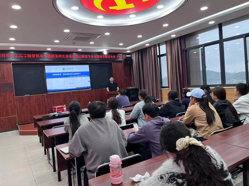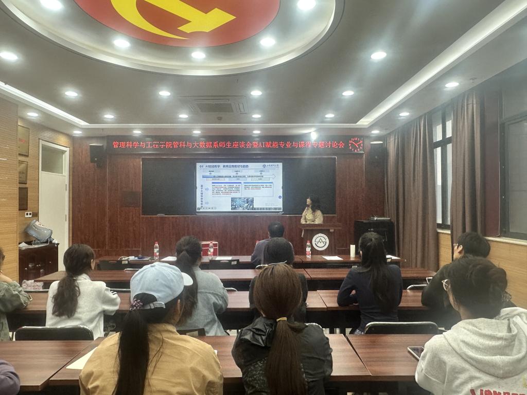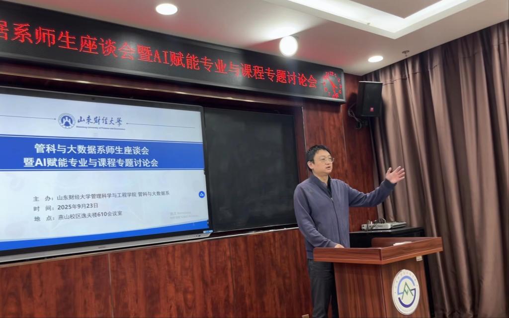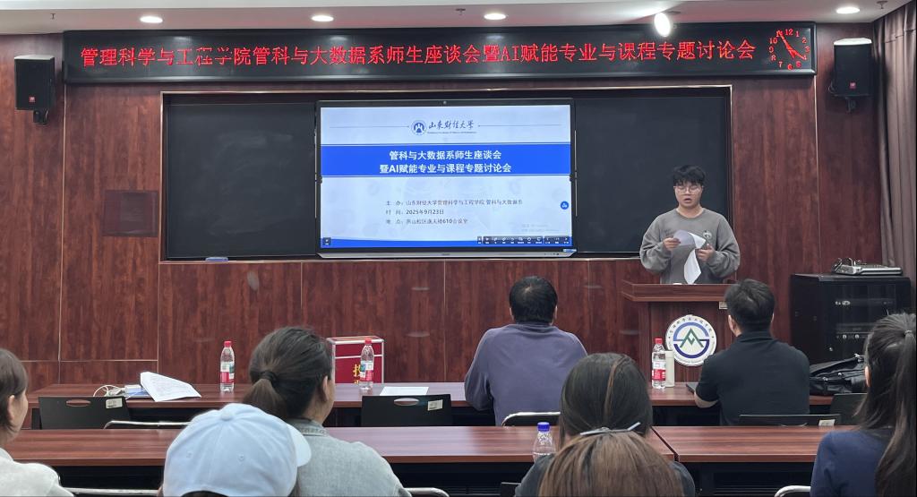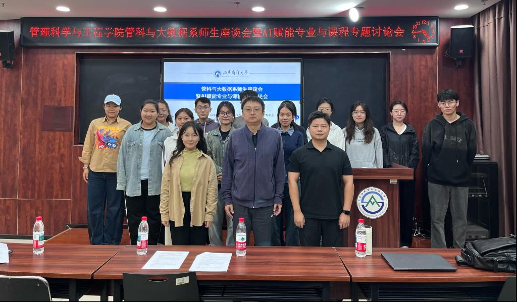 为深入推进新文科建设,加速大数据管理与应用专业的高质量发展,并积极响应人工智能时代对高等教育提出的新要求,山东财经大学管理科学与工程学院管理科学与大数据系(下简称“大数据系”)于2025年9月23日召开了师生座谈会暨“AI赋能专业与课程建设”专题讨论会。会议由学院大数据系主任杨成伟主持,大数据系两位新教师王露潼和王帅参加了本次座谈暨研讨会,大数据管理与应用专业2023级2个班以及大数据管理与应用(金融大数据)卓越班20余名学生代表参加了本次会议。