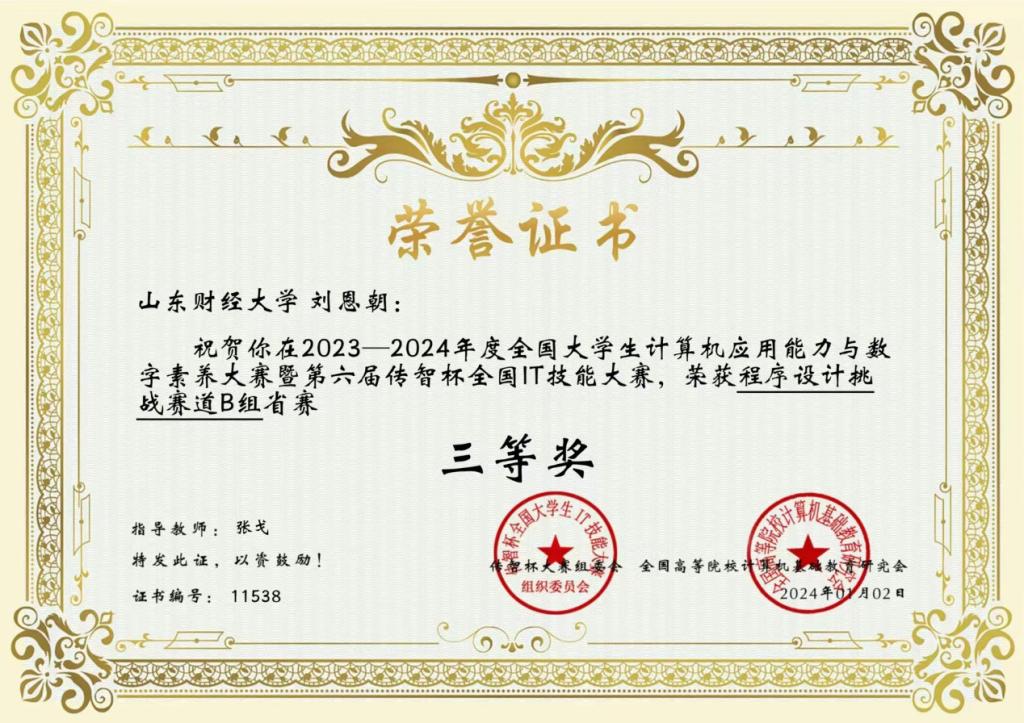刘恩朝同学凭借着扎实的编程基础和对算法的深刻理解,成功脱颖而出,在激烈的比赛中获得了省级三等奖。而他与卢浩、张桐瑞同学组成的团队则在全国算法精英大赛北部赛区中表现出色,共同努力取得了三等奖的优异成绩。