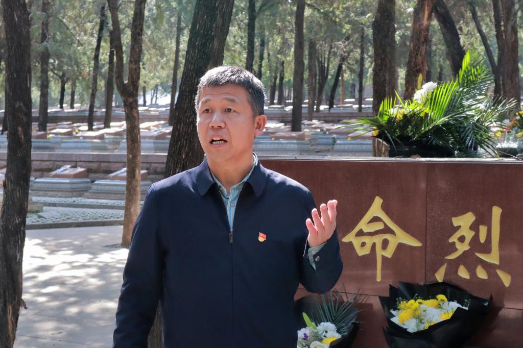 丰碑无语映山河,英魂永驻励后人。烈士浮雕墙前,两名党员代表缓步上前,向革命先烈敬献花篮,刘思锋俯身整理挽联,全体人员肃立默哀、行三鞠躬礼。随后,党员们依次敬献鲜花,朵朵黄菊寄托着对先烈的深切哀思。